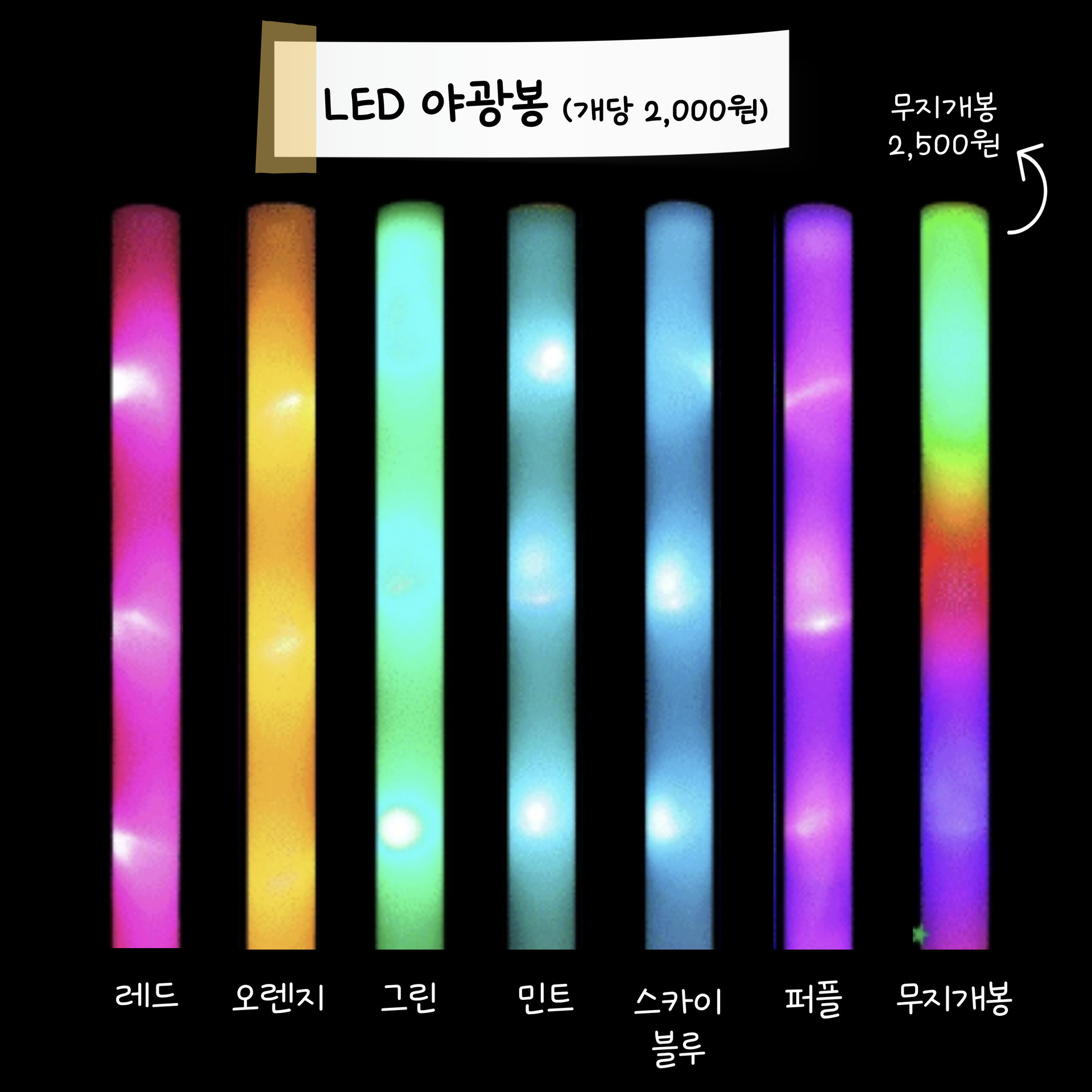 | 레드 | 오렌지 | 그린 | 민트 | 스카이블루 | 퍼플 | 칠색봉 |